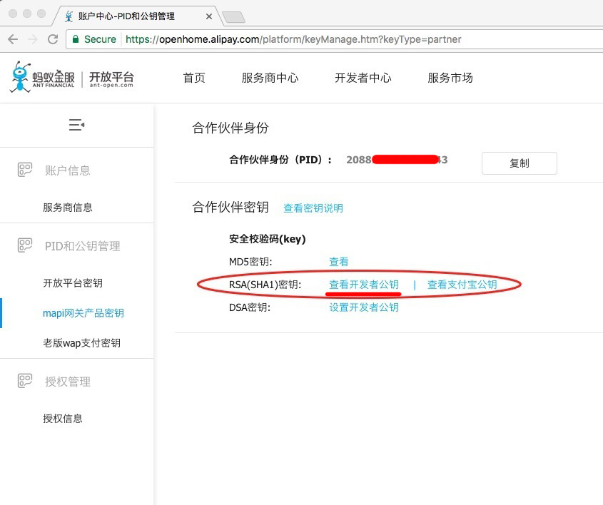 5. 复制粘贴以2088开头的 合作伙伴身份(PID) 到App配置。