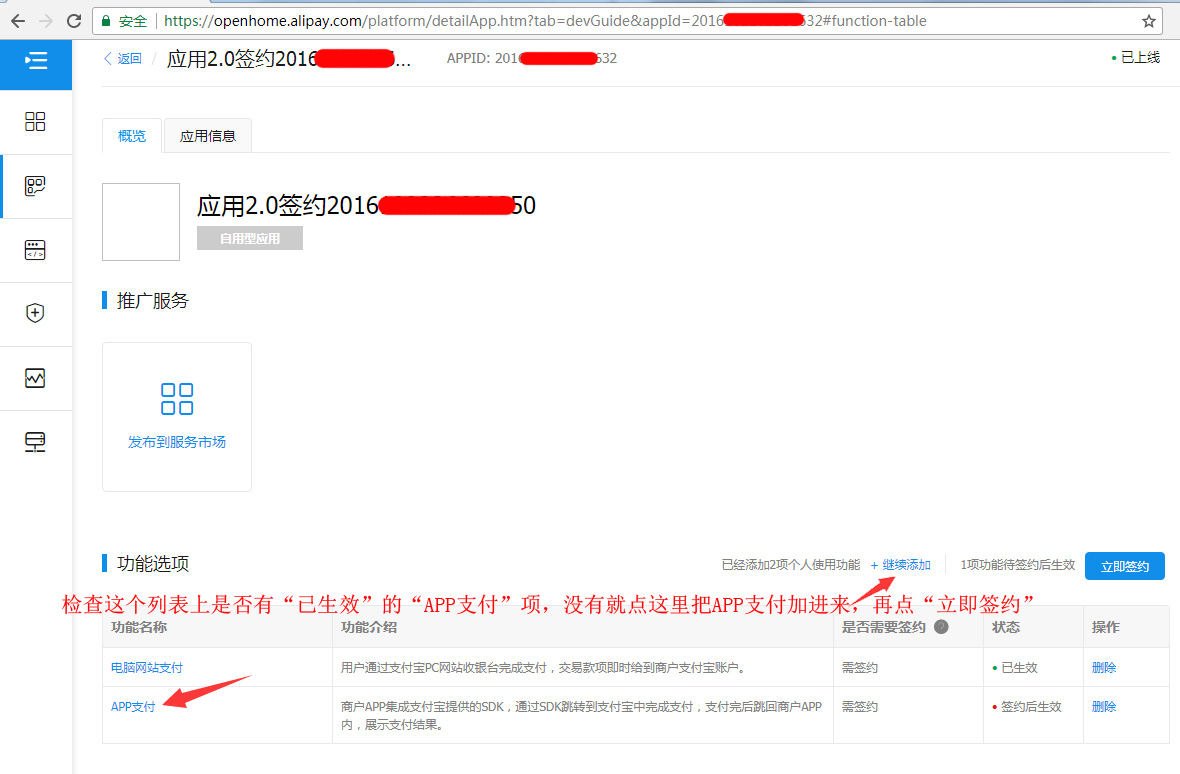 3. 点 “已上线” 的默认应用 查看,如果 “APP支付” 已签约生效就直接进入下一步,否则需签约APP支付。