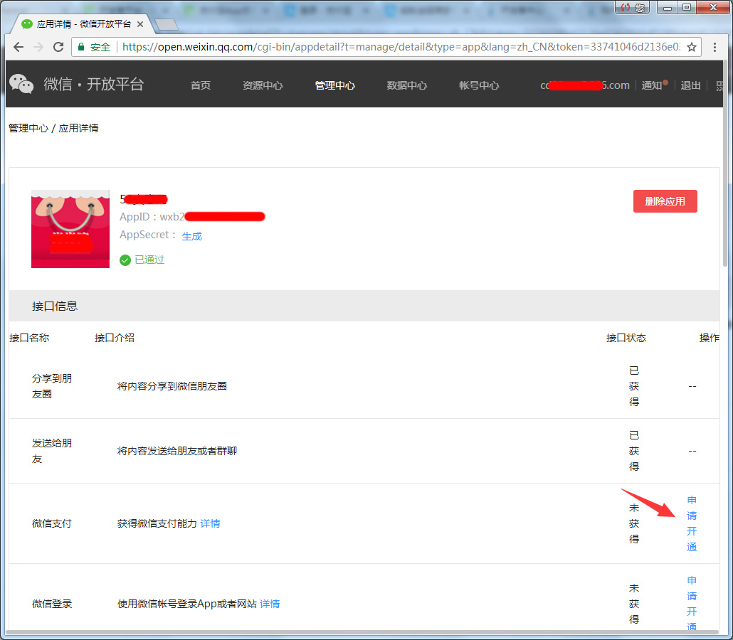 4. 等腾讯审核通过后就能得到 微信AppID,把这个id填到App配置里即可,点击 查看 申请开通 微信支付,按要求提交申请资料供腾讯审核。