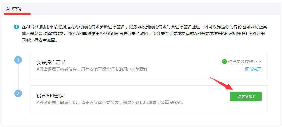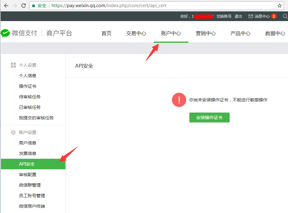 5. 微信支付审核通过后登录商户平台 https://pay.weixin.qq.com/。 点击 账户中心 - API安全,可能会提示你 安装操作证书,按要求安装即可。 此处登录账号里的那串10位左右的数字就是 商户号 mch_id,把他填到APP配置里。